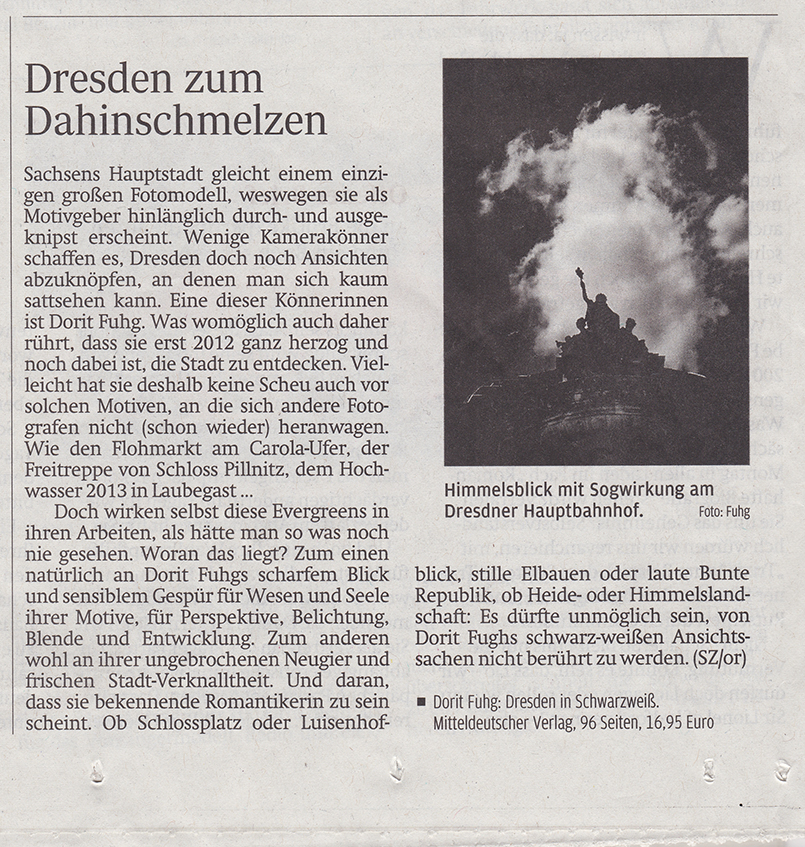 »Dresden zum Dahinschmelzen. Es dürfte unmöglich sein, von Dorit Fuhgs schwarz-weißen Ansichtssachen nicht berührt zu werden.« Artikel